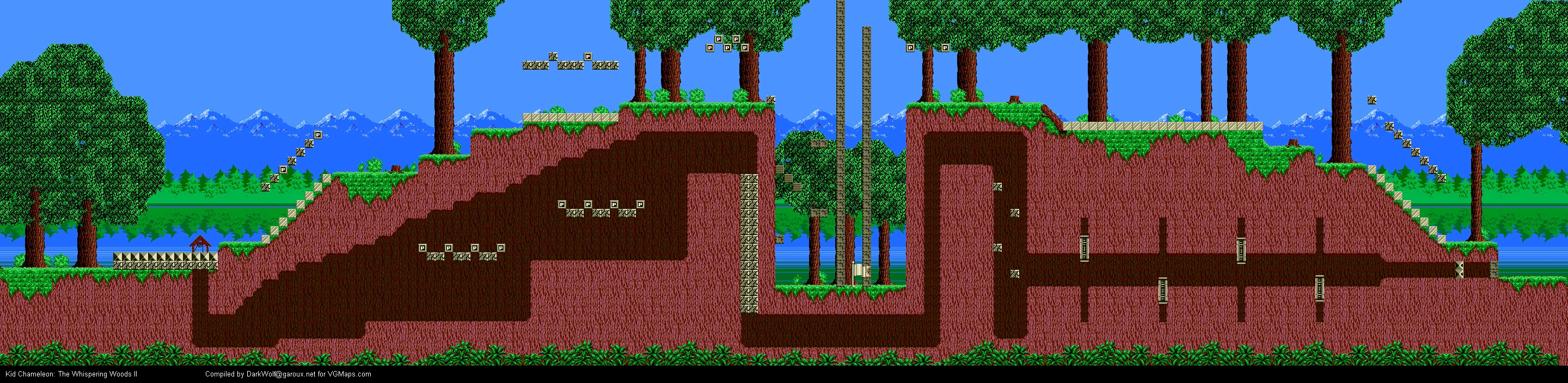 The Whispering Woods 2 is a Woods-themed level in the second stage of Kid Chameleon. If you haven't visited this level yet, take a look at the crazy map you'd have to navigate through below. This level is pretty unique in that it presents beginning players with three challenges at once: dodging an army of enemies, instant-death platforms, and running out of time!